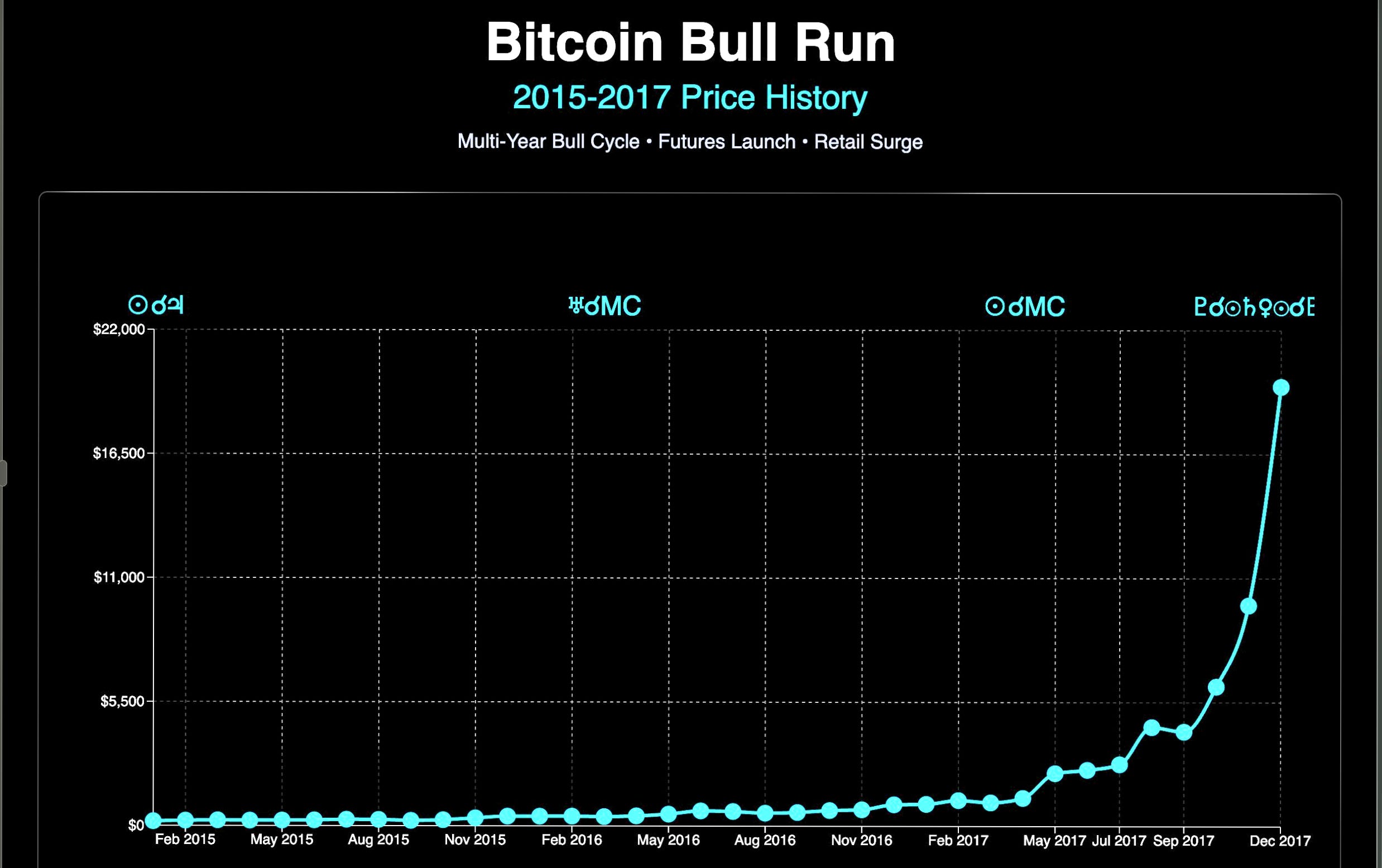 From 2015 to 2017, Bitcoin rose from sub $200 lows in 2015 to nearly $20,000 in mid‑December 2017, a cycle that included a dramatic late‑2017 explosion as retail interest surged, marking one of Bitcoin’s largest percentage advances from trough to peak. A Bitcoin halving event in July 2016 reduced supply, one factor amongst many which caused thriving price appreciation throughout year.