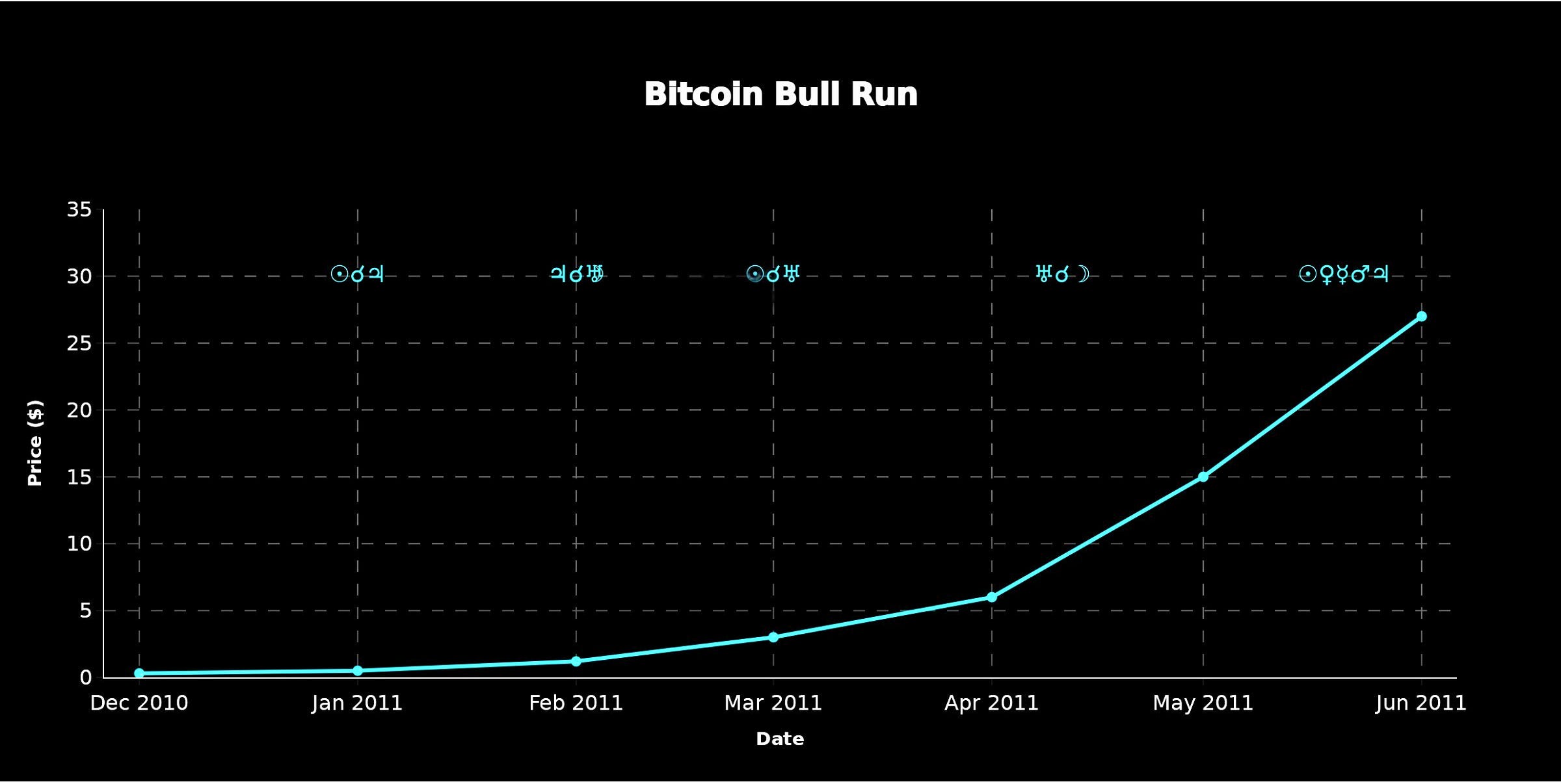 In early 2011, there was a Jupiter-Uranus conjunction at 27 degrees Pisces, with this occurring over Bitcoin’s 8th house of deep transformation, investment money and other people’s money. Jupiter is expansion. Uranus is revolution and rules cryptocurrency. Put them together over Bitcoin’s 8th house, and you see the starting gun for the price rise which lasted into June 2011.