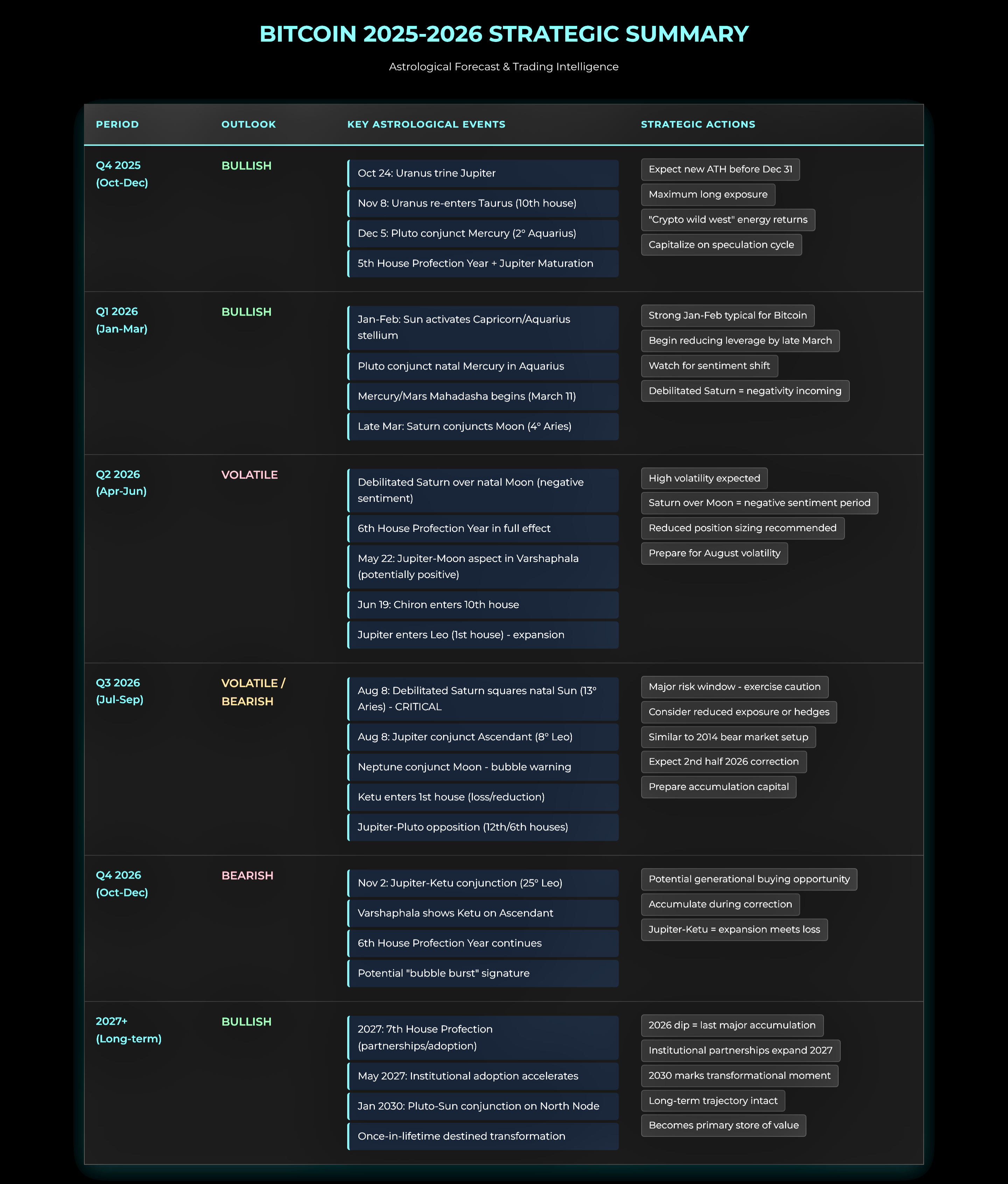 For active traders, prepare for heightened volatility and potential reaccumulation opportunities during this period. Long-term investors should recognize that while 2026 could present significant challenges similar to the 2014 bear market, Bitcoin’s fundamental trajectory toward becoming society’s primary store of value remains intact, making any major correction an accumulation opportunity before the more favourable 7th house profection year beginning in 2027 and the transformational Pluto-Sun conjunction on Bitcoin’s North Node in January 2030.