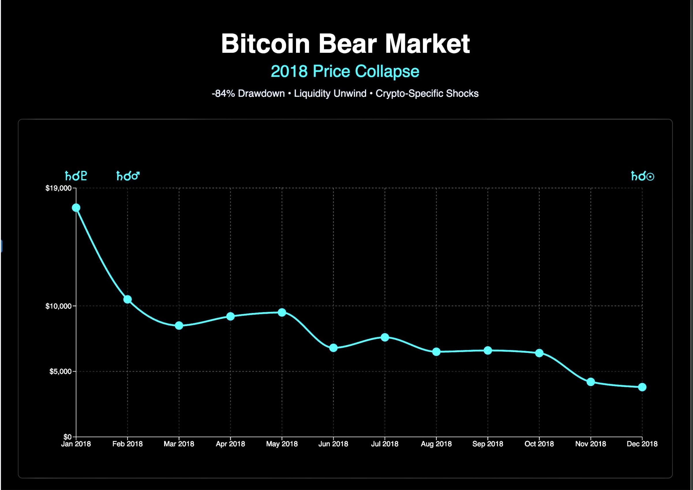 The January 2018 peak to Dec 2018 trough fell roughly −84% for Bitcoin representing one of the most severe drawdowns in Bitcoin’s modern era as liquidity unwound and crypto‑specific shocks hit the market