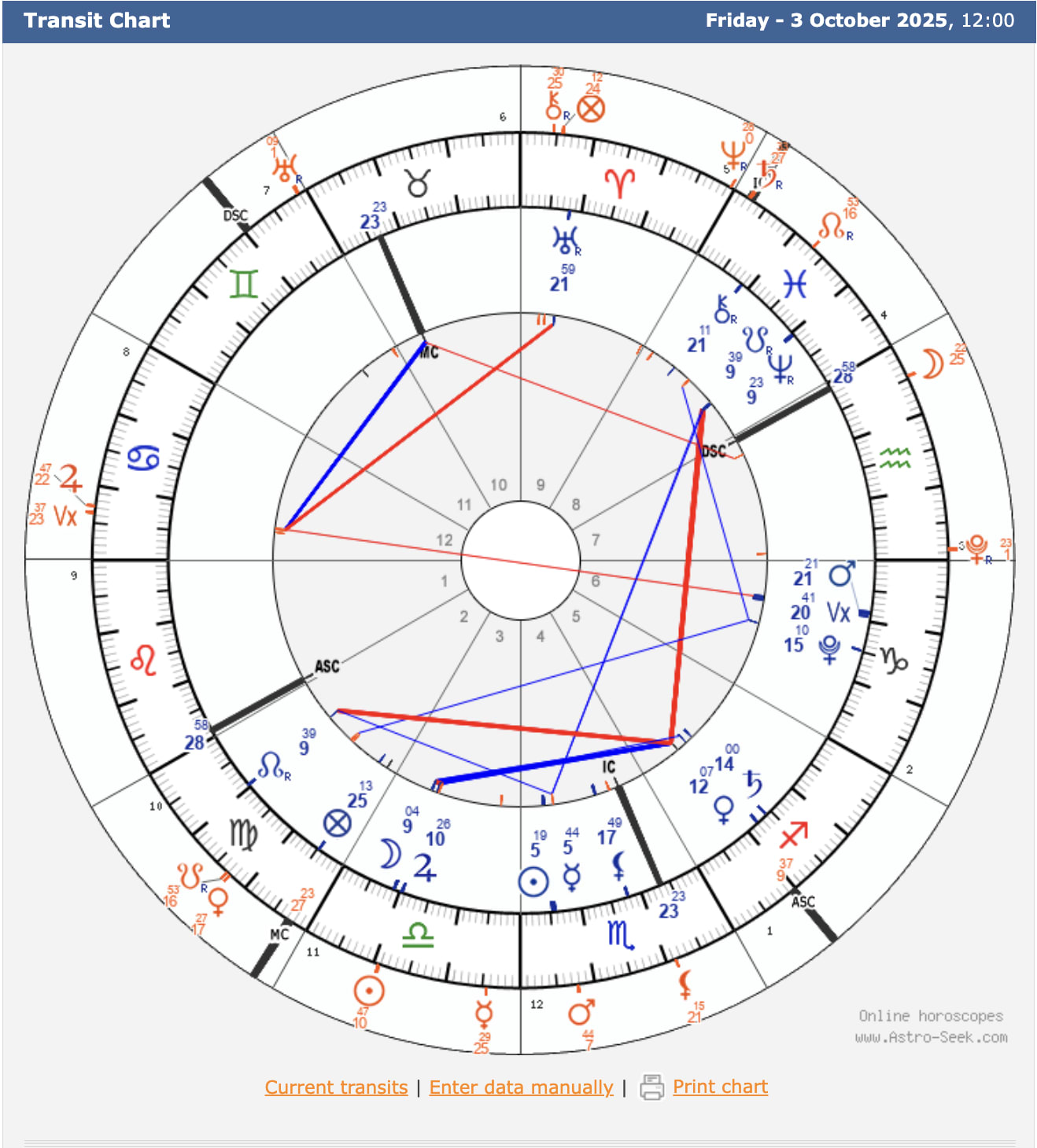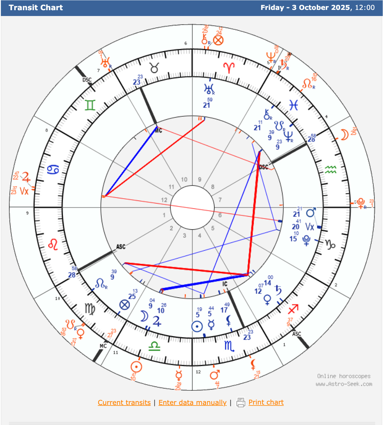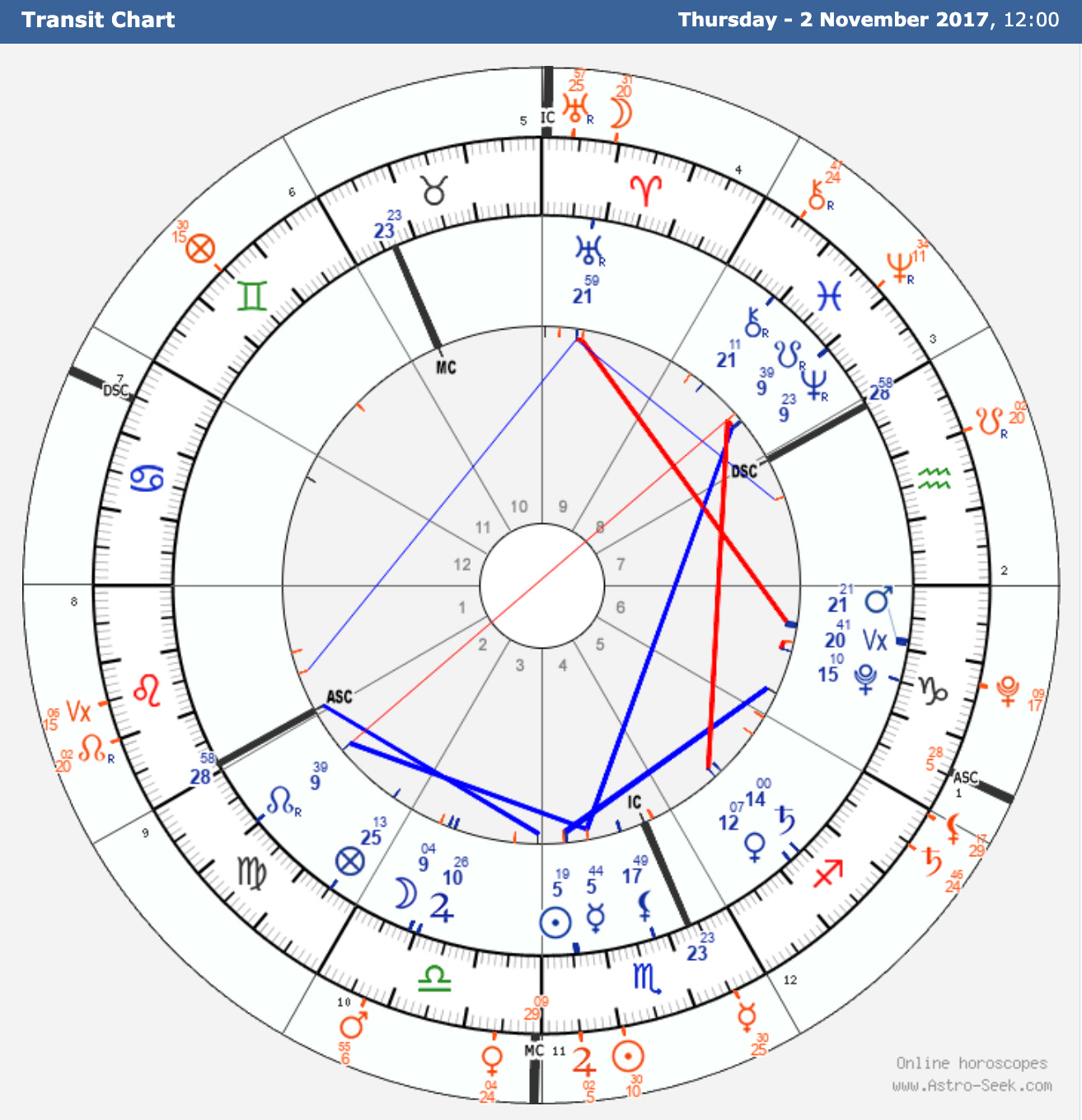 Then, on October 26th 2017, we see the transiting Sun and Jupiter conjoin at 3 degrees Scorpio. This is within just 2 degrees of the natal Sun/Mercury conjunction at 5 Scorpio. On 2nd November 2017, transiting Jupiter conjoins the natal Sun. This was a potent once-per-12-year transit. That occurs far less often than the once-a-year transit of the Sun to a natal Jupiter.