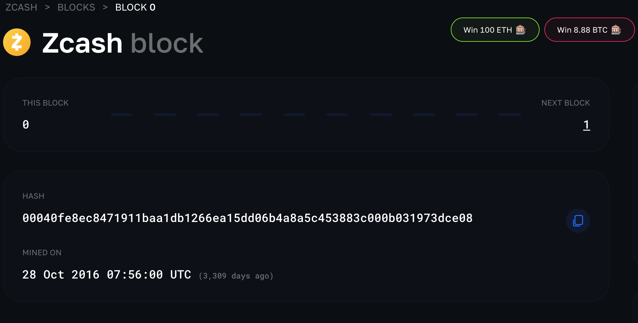 Using a simple blockchain explorer, we can easily find the genesis block of Zcash.