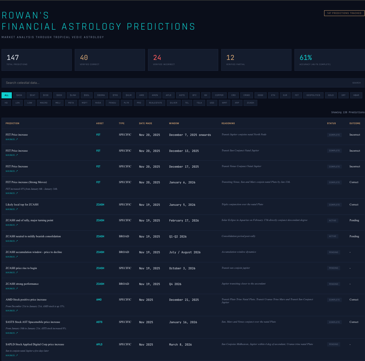 There are very few astrologers or stock traders who track their predictions transparently and publicly, as I do here. This is my attempt to raise the bar and maintain accountability. I expect my accuracy rate to start out at a modest level and improve gradually over time as the dataset of predictions grows. The goal isn’t perfection, it’s progress, iteration, and refinement.