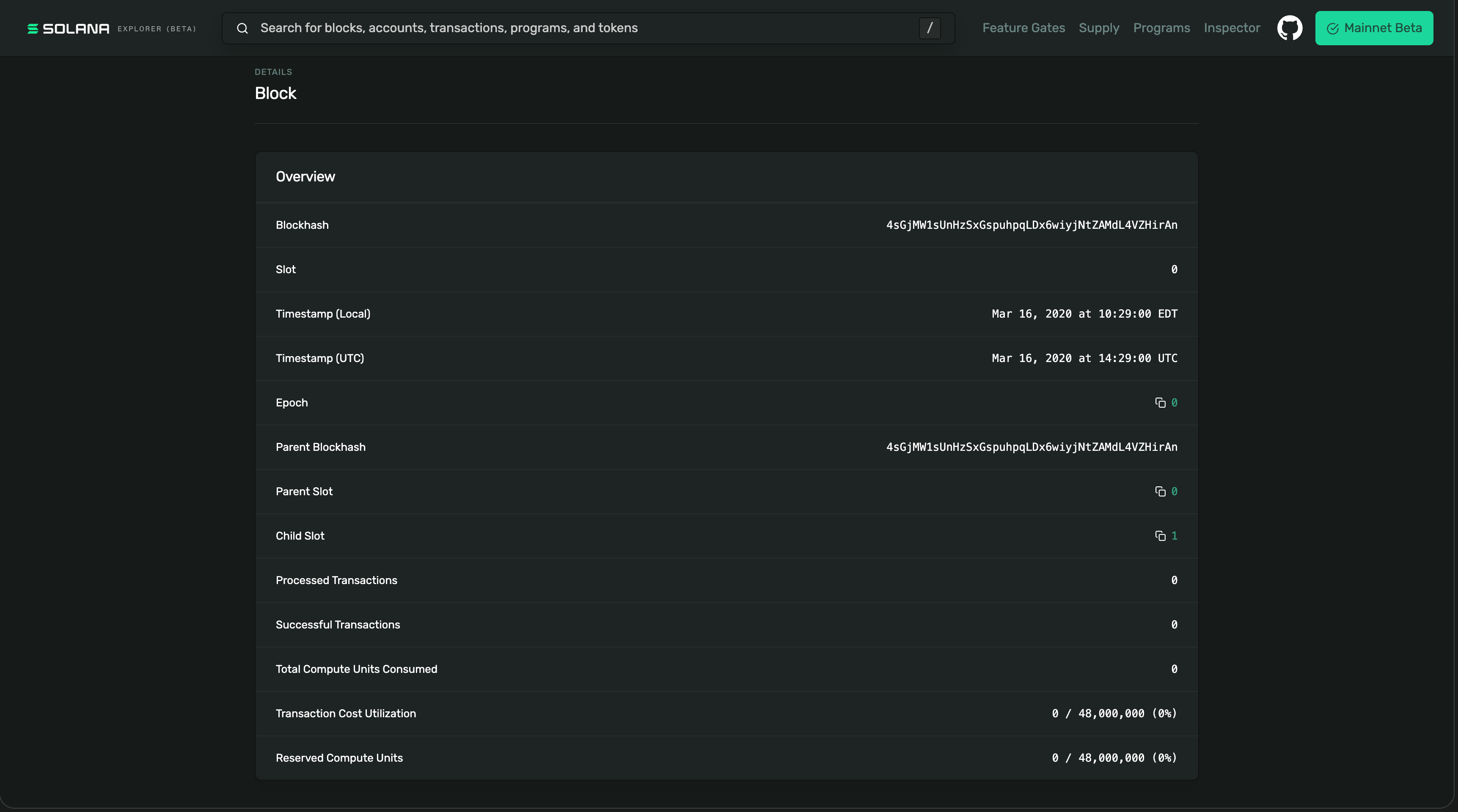 Using Solana’s own blockchain explorer, solscan.io, we can easily find the genesis block - block 0.