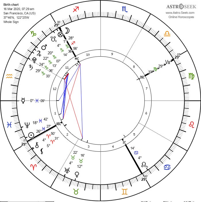 We also know that the LinkedIn company profile for Solana Labs’ headquarters is listed as being in San Francisco, California, when it was founded in 2018. Taking into account the local time, this gives us the following astrological chart details for Solana: