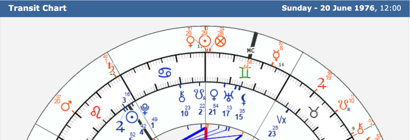In this chart, for June 1976, we do see Ketu conjoining the natal Mars in the 2nd house around this time. As Ketu represents reduction, the 2nd house represents everyday money, and Mars can relate to action, aggression and value, it holds good archetypal imagery. But the Mars image doesn’t create as much of a unique hit of crisis as having the natal Saturn conjoin the natal Pluto as per our other chart.