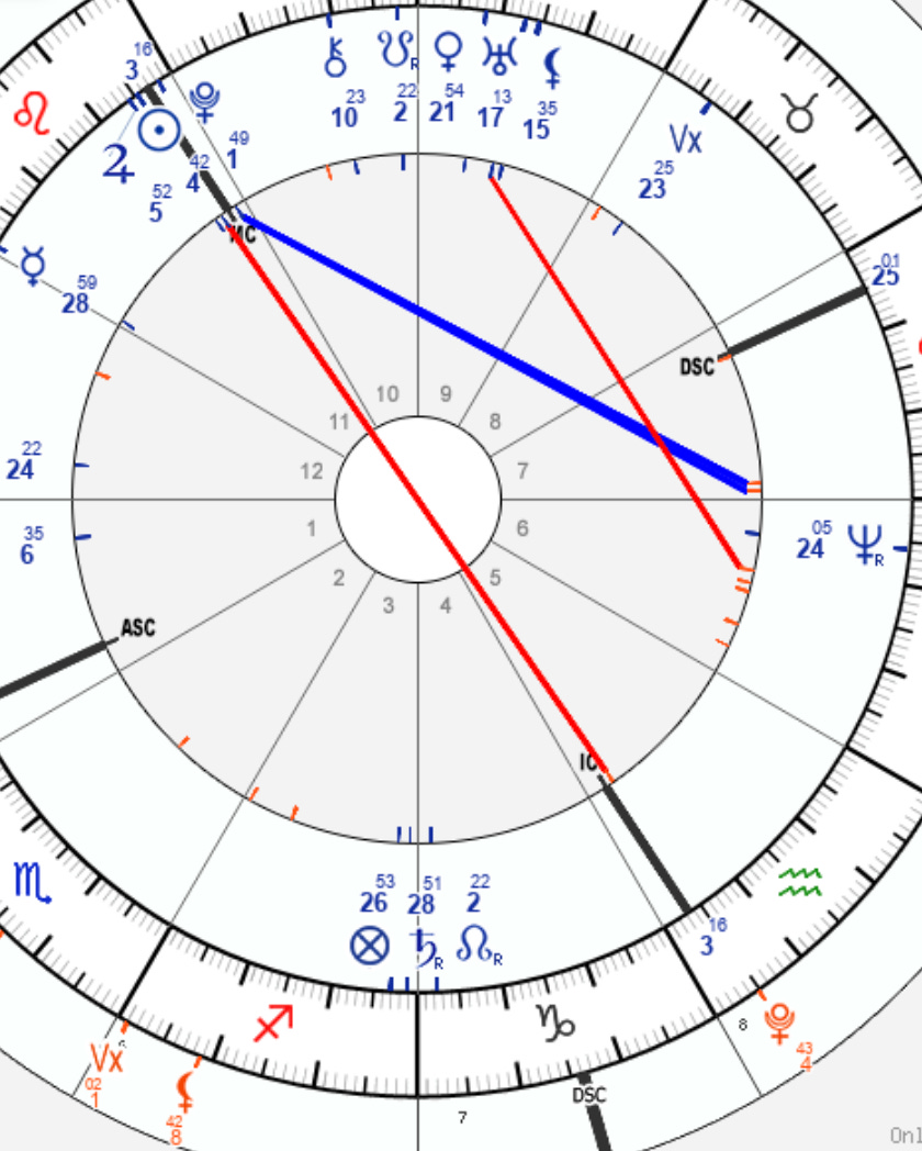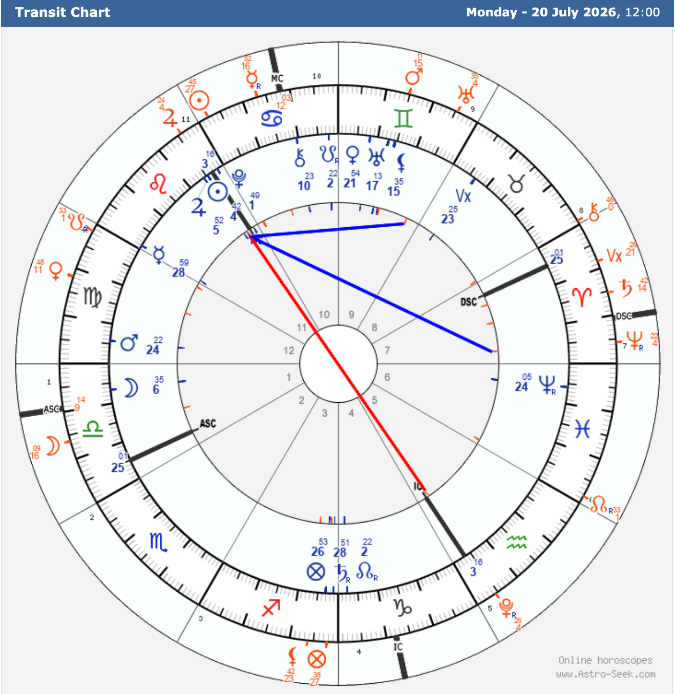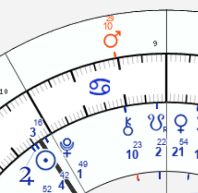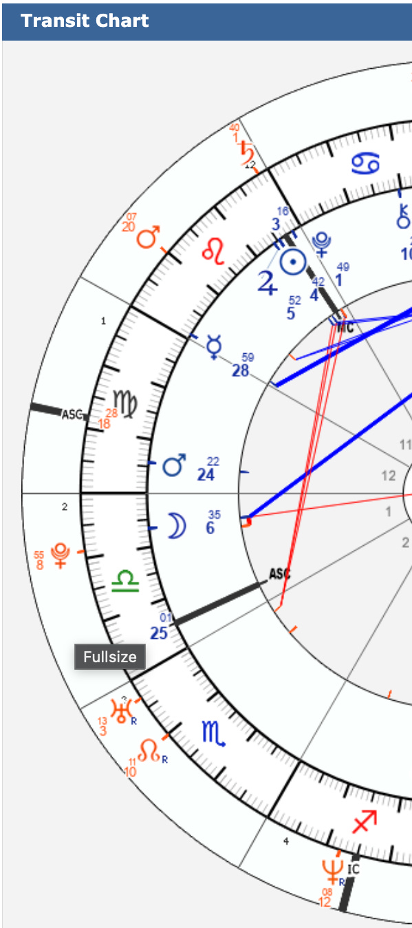 Neptune and Uranus are in an interesting wide conjunction over the natal Sun, but it’s within 4 degrees, and I prefer a much tighter orb of 1 or 2 degrees when dealing with outer planets because they are simply related to much longer periods of time.