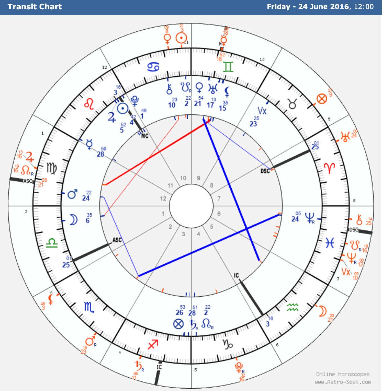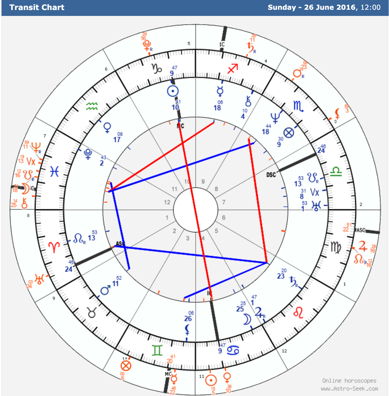 Venus at 10 Cancer in the 4th house of home and foundations directly opposes the natal Sun at 10 Capricorn. A sense of rejection of leadership, rejection of mainstream values, a vote for new values in relation to the “home” of the UK. Neptune, Ketu, Moon and Chiron in the 12th house of loss, foreigners, dispersion and “leaving” is heavily activated.