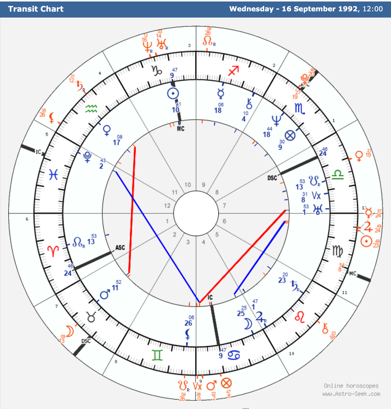 Transiting Uranus, which represents shocks, upheavals, surprise moves and the unexpected, was transiting in the early degrees of the 2nd house - related to finances and money, and it was squaring the natal Sun within 1 degree. This really represents an ongoing negative shock to the “life force” of the pound.