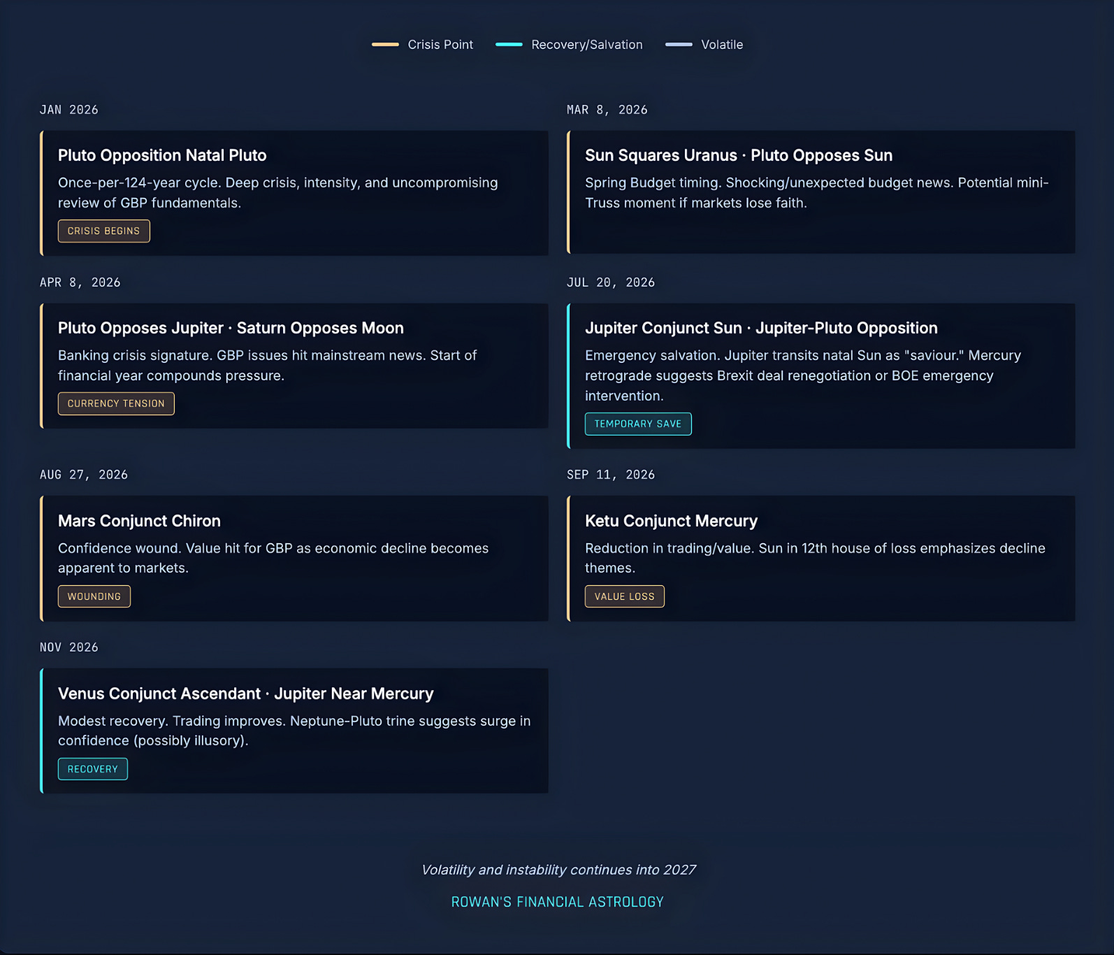 The transit analysis for the British Pound in 2026 reveals that the year is defined by extreme volatility and a challenging push-pull dynamic, strongly confirming the background anxiety of the 8th House Profection and the Ketu Mahadasha. A temporary salvation event occurs in July, possibly in the midst of a wider banking crisis, pointing to some form of emergency restructuring or trade renegotiation at this time. This is highly confluent with the critical June 30th expiration of key Brexit trade agreements. The impacts of this event will still be felt by Q3 and Q4, and the Pound could continue its struggle into 2027.