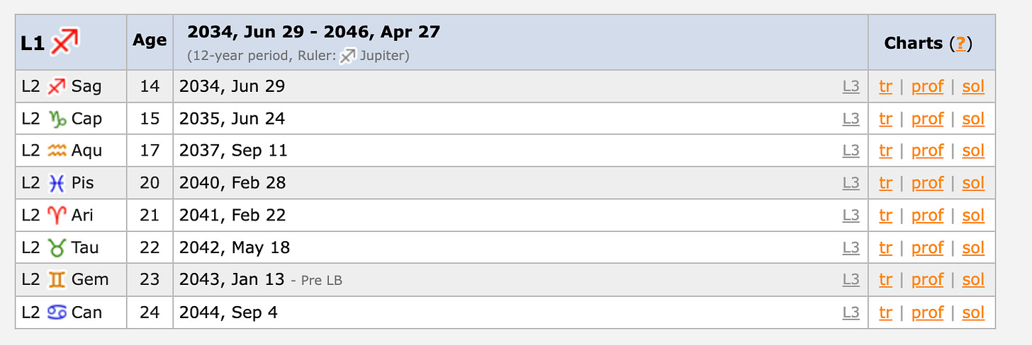 But it gets stronger, because by 2034 HBAR enters a new Level 1 Sagittarius period, ruled by Jupiter. Not only is this the most positive planet, but remember that Jupiter sits in its own sign of Sagittarius in the natal chart, in the auspicious 9th house - Jupiter’s “own” house, considered in the Vedic system to be associated with positive Karma, luck and correct worldview.