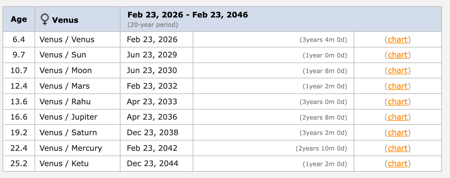 From February 23rd, 2026, it will enter a Venus Mahadasha for the next 20 years. This looks strong, because Venus, the lesser benefic, symbolizing wealth and luxuries, is in her own sign of Libra - the marketplace. This is a solid start to the new '“Chapter” of Hedera which begins in 2026 and goes for 20 years until 2046.