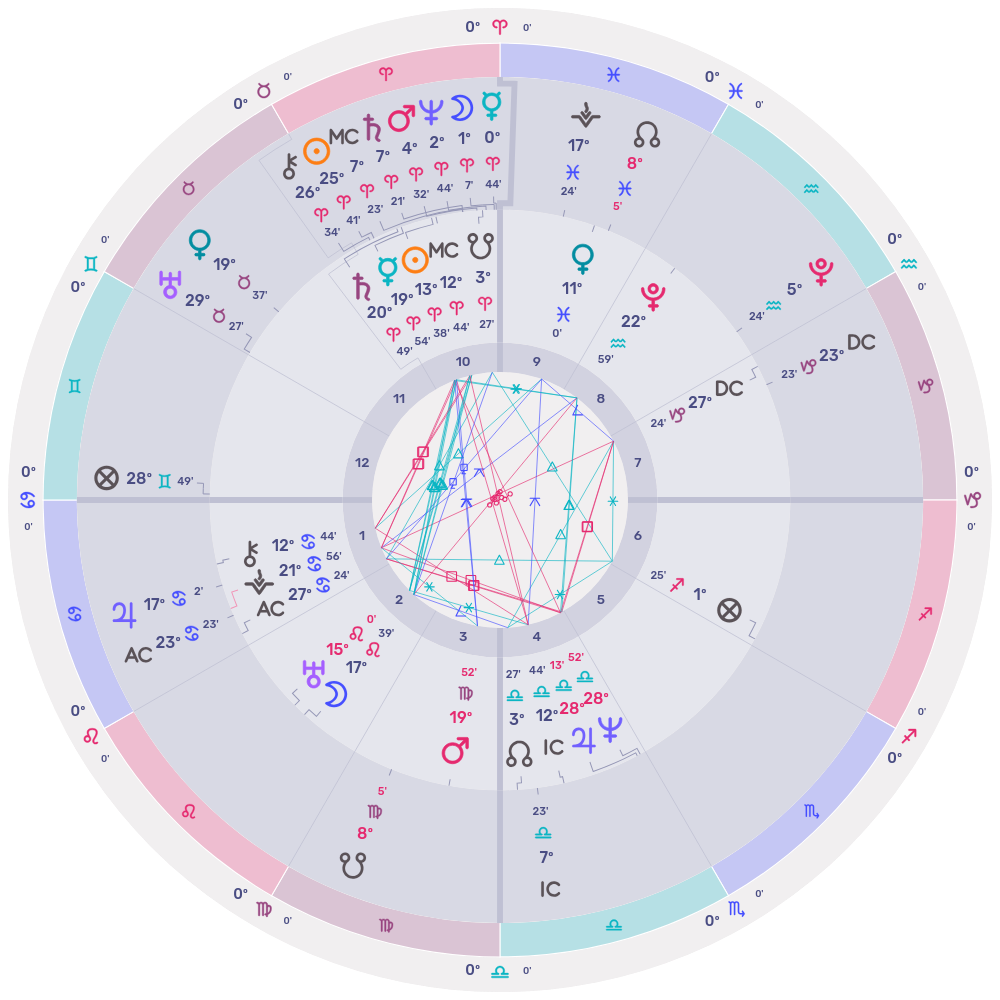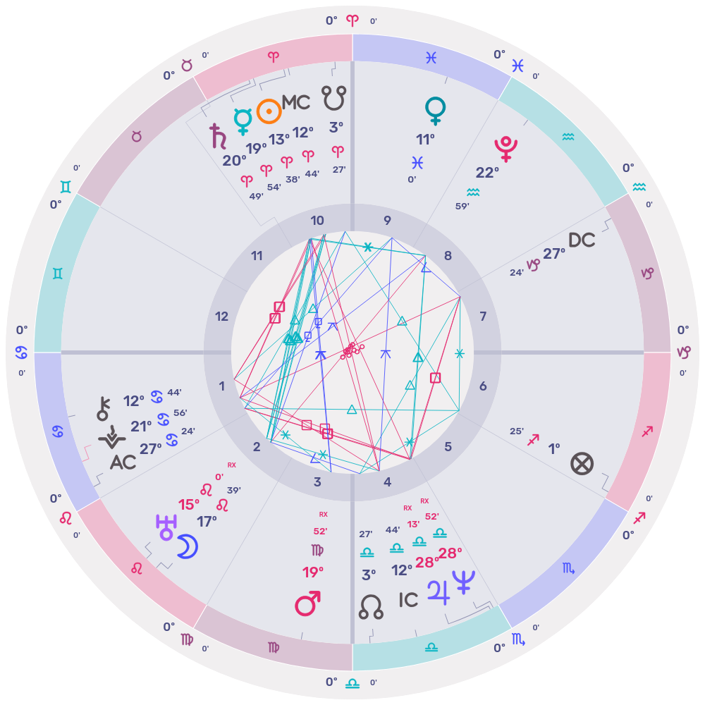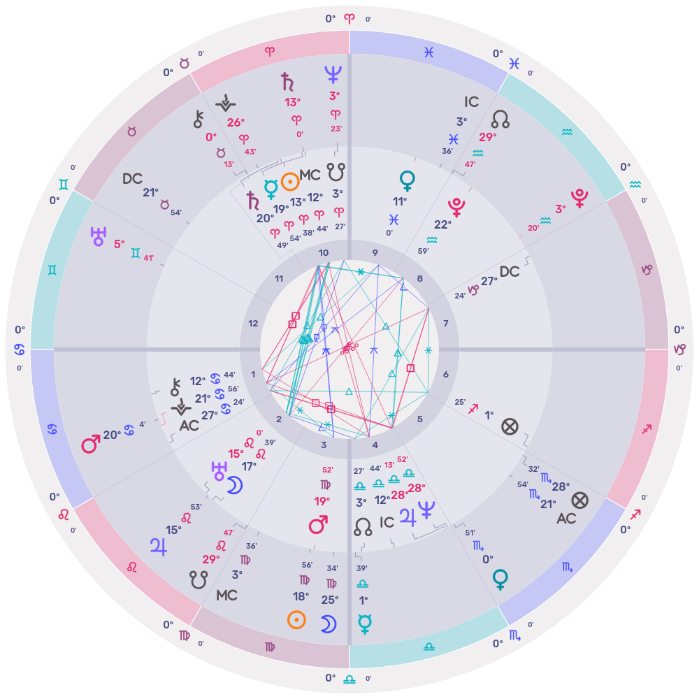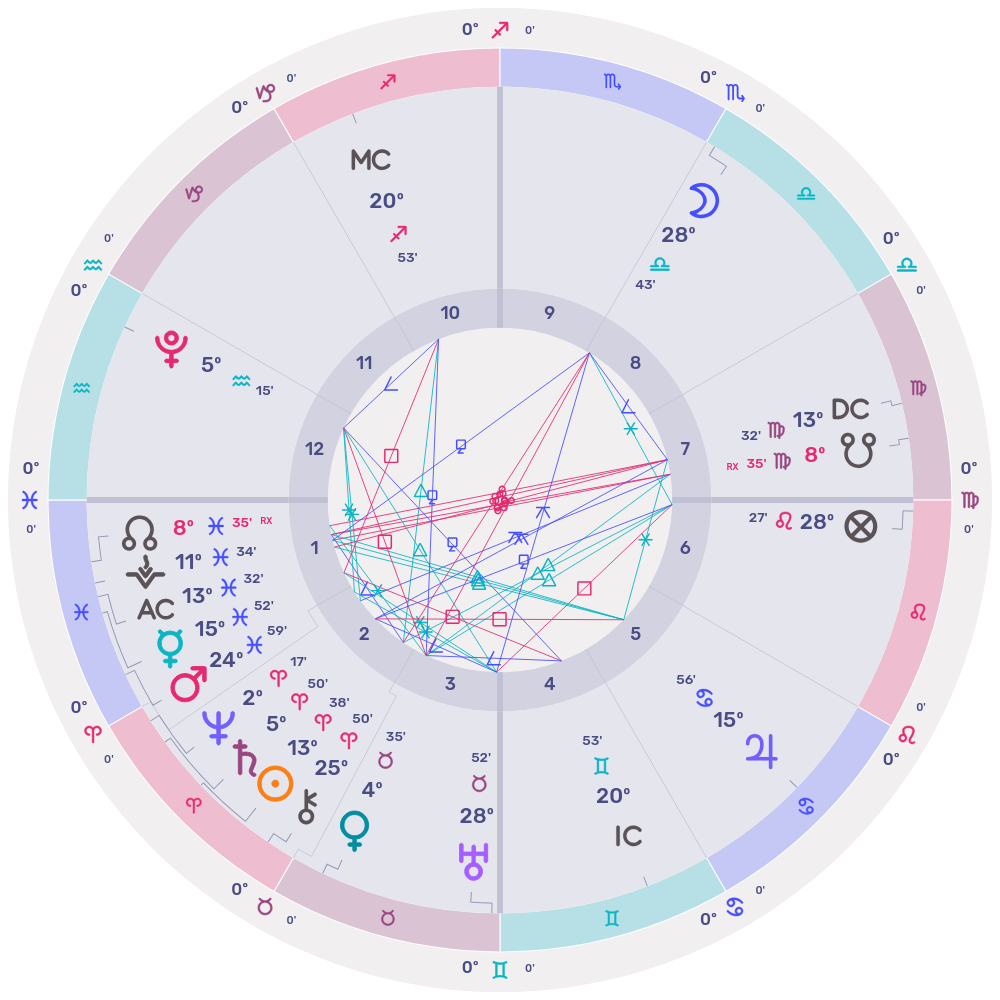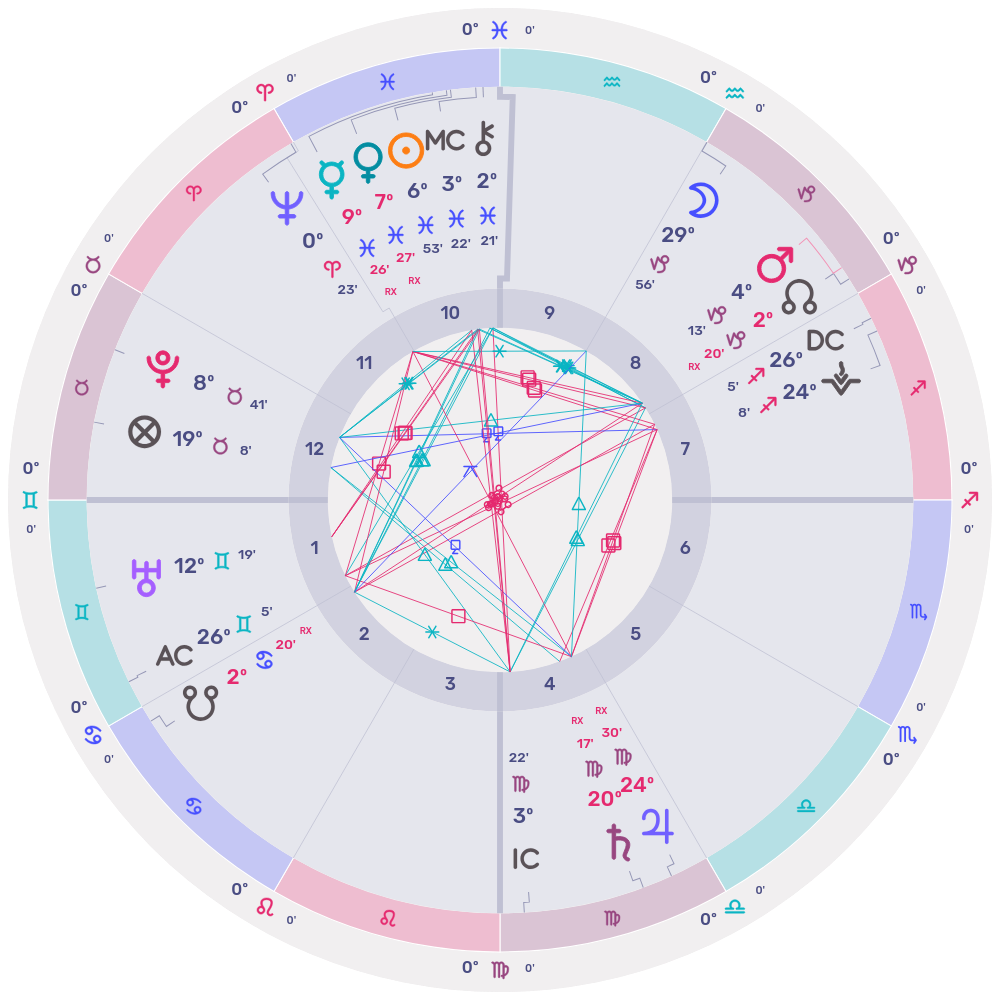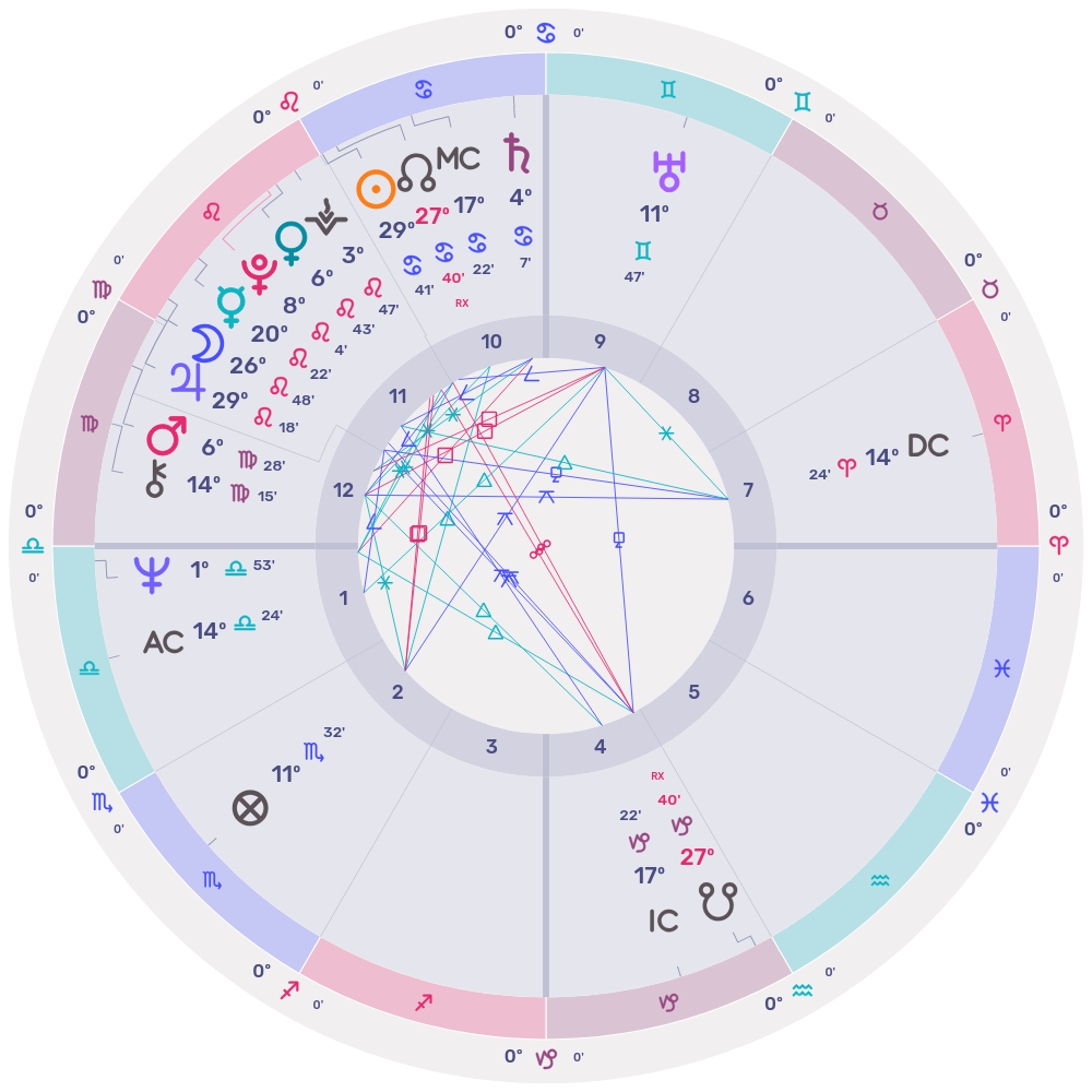 The sun also highlighting the focus on everyday money and resources for this chart. The 2nd house ruler is in the 1st, the the Moon is in the 8th house of crisis, debt and investment money ruled by Venus in her own sign in Taurus in the 3rd. It’s actually a fairly mixed bag, with some positive and negative elements.