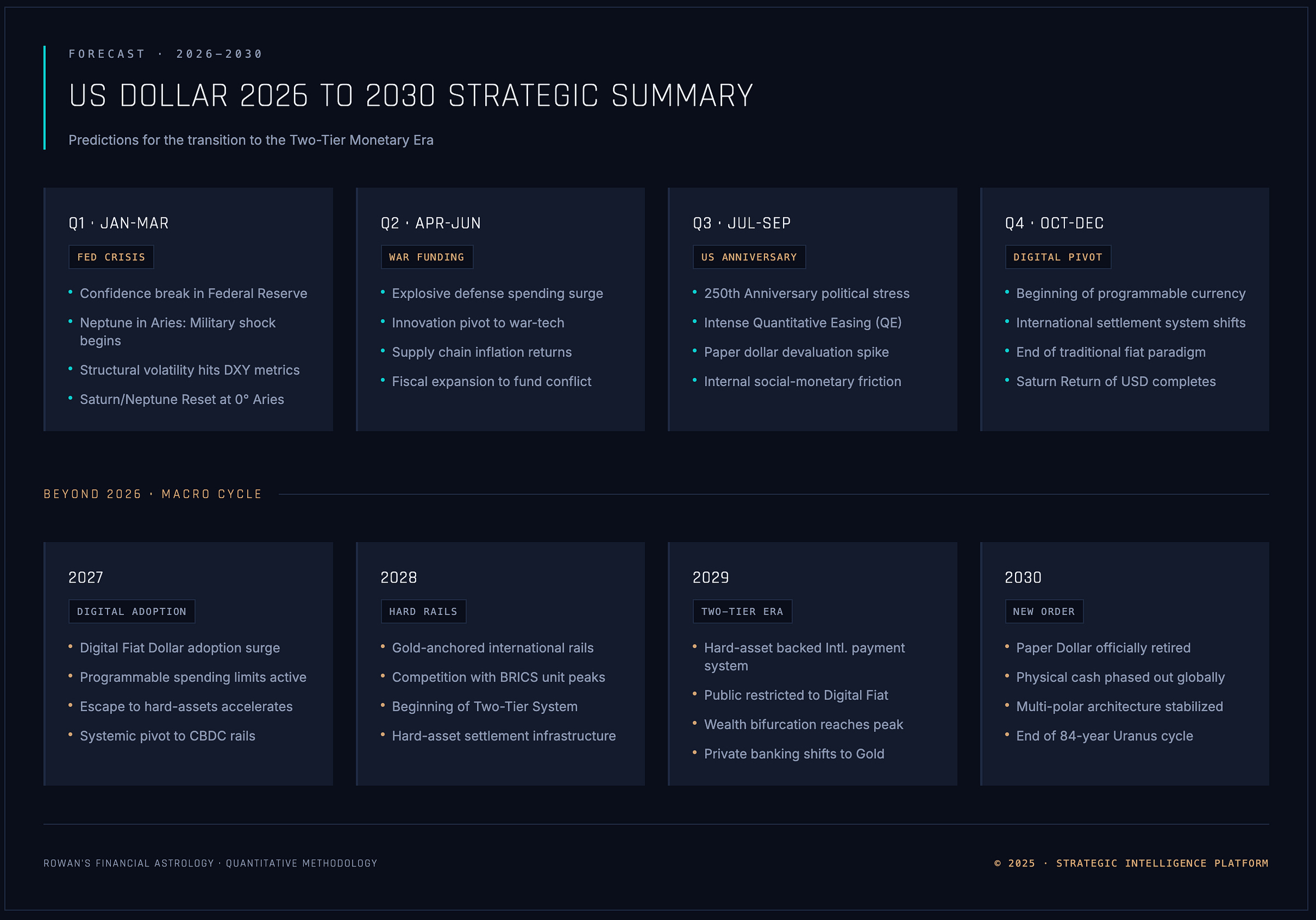 The US is experiencing its first Pluto return, a cycle of about 248 years since 1776, signalling a total structural reset. As Uranus enters Gemini in 2026, I expect the emergence of a two-tier dollar over a 5 year period. A programmable fiat version for the public and an asset-backed version for international settlement.
