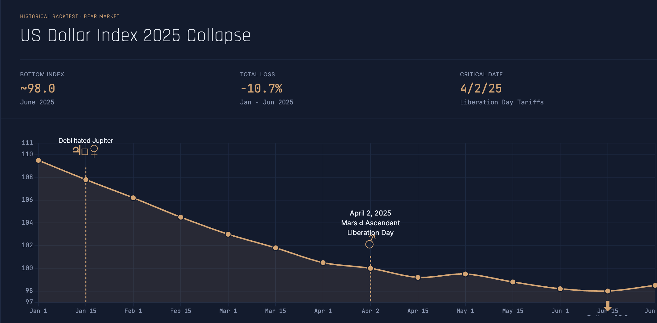 By the time the tariffs were announced in April 2025, a debilitated Mars, associated with cutting and severing, conjoined the natal ascendant of the US Dollar chart at 27 Cancer. This really encapsulates the aggressive cutting to trade relationships which also had a negative impact on the dollar chart and the value of the dollar.