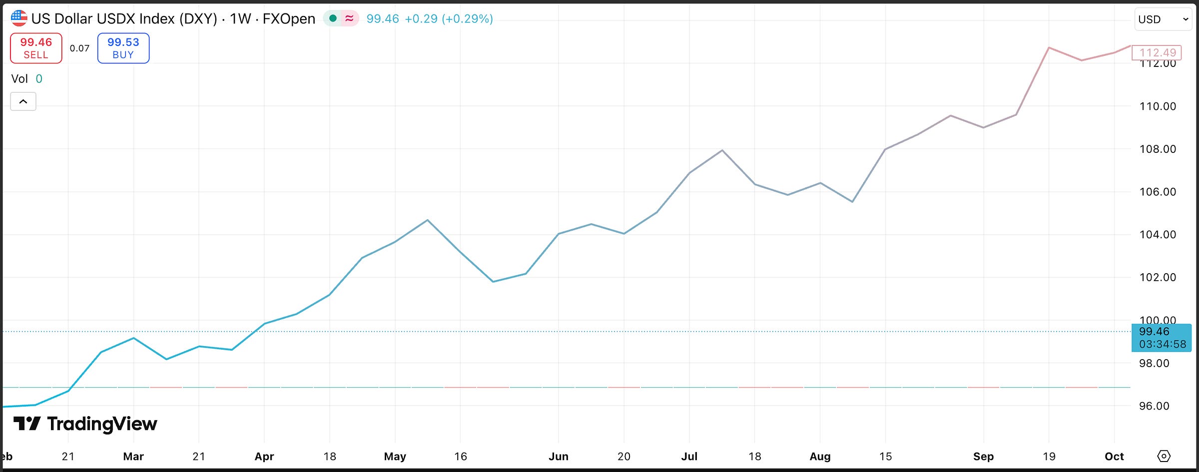 From February to September 2022, the US Dollar Index climbed from around 96 to about 110 - it’s highest level since the early 2000s. This chart shows the huge growth of the strength of the dollar against a basket of other global currencies during that time period.