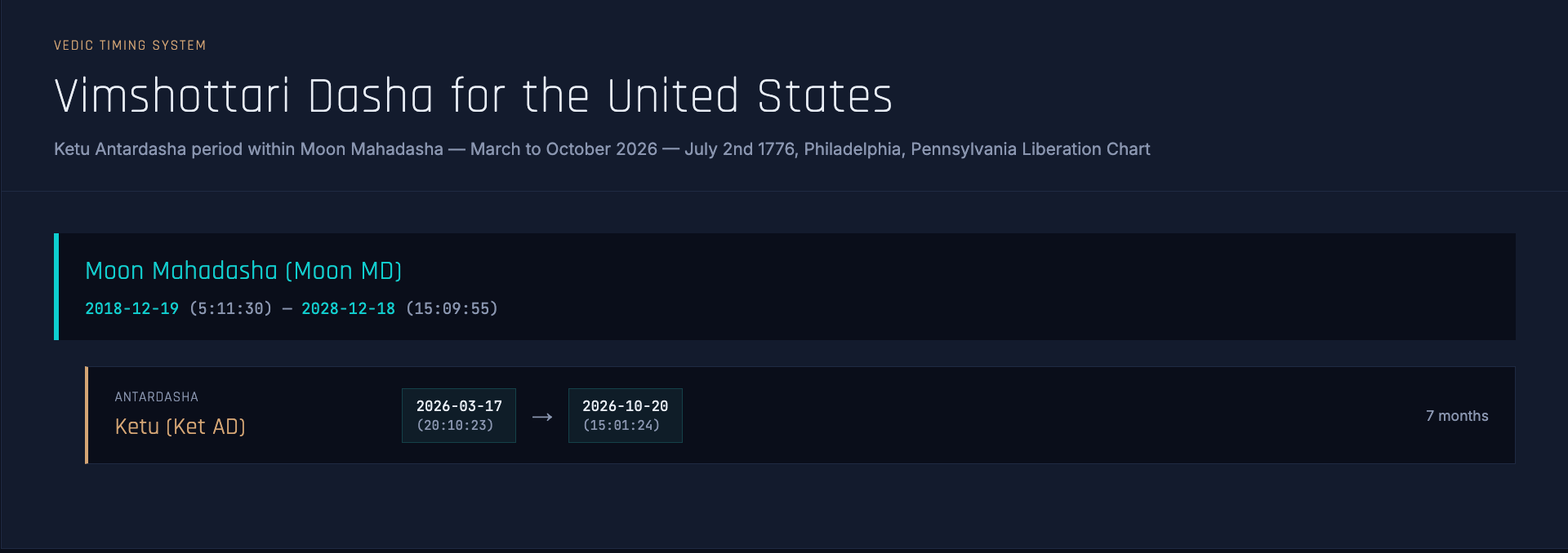 If we choose to use the “Liberation Chart” for the USA, set to July 2nd, 1776 when the congressional vote for independence actually occurred in Philadelphia Pennsylvania, we see that this chart for the USA is going to start a Ketu sub-period from March 17th 2026.